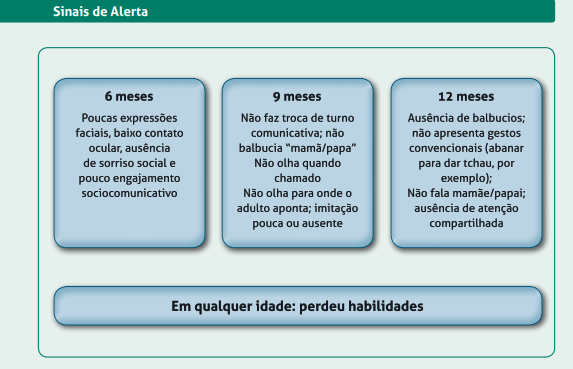 Dentre esses sintomas, vale destacar: anormalidades no controle motor, atraso no desenvolvimento motor, sensibilidade diminuída a recompensas sociais, afeto negativo e dificuldade no controle da atenção. Na tabela abaixo você confere sintomas específicos dos 6 meses, 9 meses e 12 meses de idade: