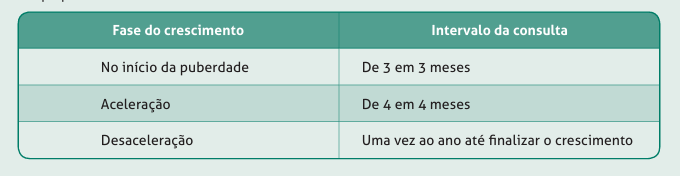 Para acompanhar o crescimento puberal do adolescente, a Sociedade Brasileira de Pediatria (SBP) orienta que as consultas aconteçam: